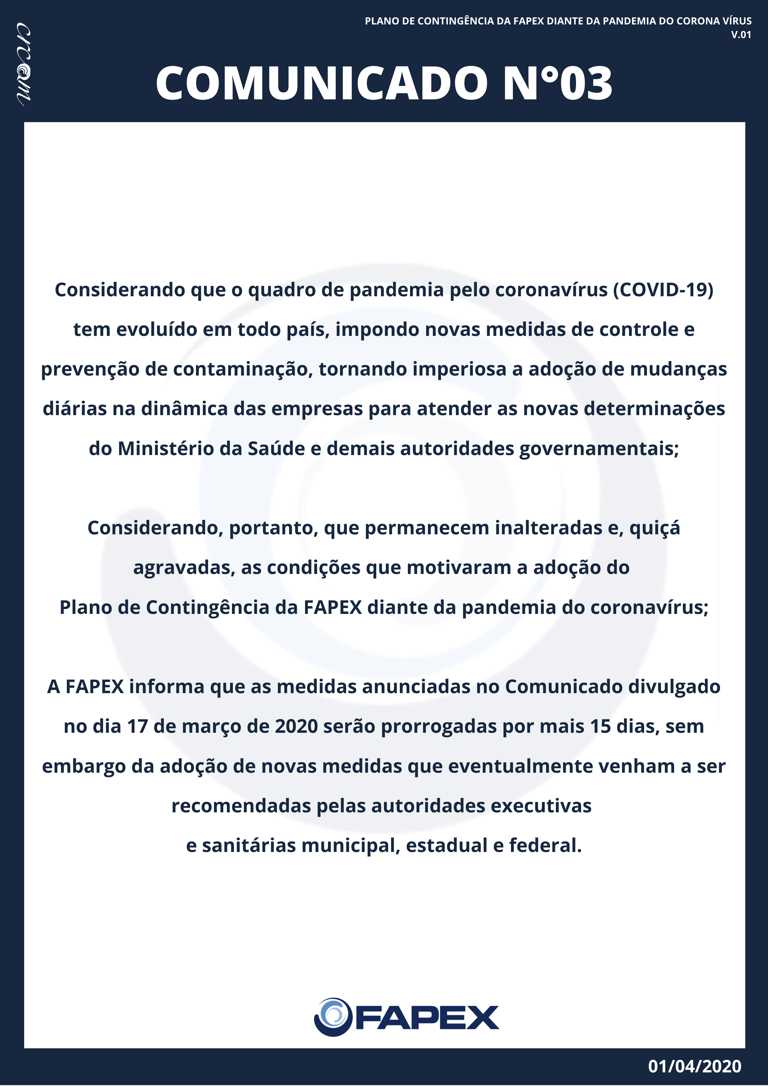 Comunicado 03: Plano de Contingência - 01.04.2020