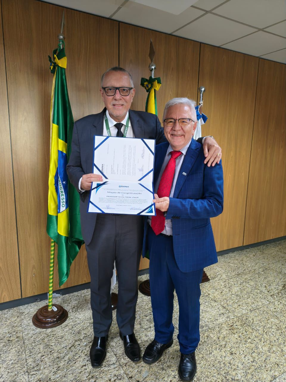 A honraria foi entregue pelo Diretor Executivo da FAPEX e Presidente do Conselho Nacional das Fundações de Apoio às Instituições de Ensino Superior e de Pesquisa Científica e Tecnológica (CONFIES), Professor Antonio Fernando Queiroz, e reconhece a nomeação do Professor Olival para a Presidência do CNPq, destacando sua trajetória acadêmica e sua contribuição para o fortalecimento do ecossistema de ciência, tecnologia e inovação (CT&I), do país.