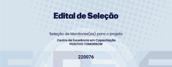 O Instituto de Computação da Universidade Federal da Bahia, em apoio ao Projeto nº 220076, mediado pelo instrumento POSITIVO/FAPEX/UFBA nº 391/2022 torna pública a abertura de inscrições no processo seletivo simplificado para contratação de MONITOR(ES) para o projeto "Centro de Excelência em Capacitação POSITIVO TOMORROW”.