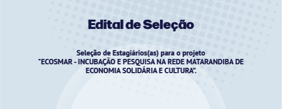 A Universidade Federal da Bahia em apoio ao Projeto no 200002, torna público o Edital referente à seleção de estagiários(as) para o projeto “ECOSMAR - INCUBAÇÃO E PESQUISA NA REDE MATARANDIBA DE ECONOMIA SOLIDÁRIA E CULTURA”.