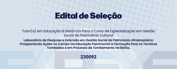 Universidade Federal da Bahia (UFBA) por meio da Escola de Administração, em parceria com o Instituto do Patrimônio Histórico e Artístico Nacional (Iphan), através da Fundação de Apoio à Pesquisa e à Extensão – FAPEX, com fundamento no Convênio nº 64/2023, firmado com a UFBA para a gestão administrativa e financeira do Projeto FAPEX Nº 230092: LABORATÓRIO DE PESQUISA E EXTENSÃO EM GESTÃO SOCIAL DO PATRIMÔNIO AFROBRASILEIRO: PROSPECTANDO AÇÕES NO CAMPO DA EDUCAÇÃO PATRIMONIAL E FORMAÇÃO PARA OS TERREIROS TOMBADOS E EM PROCESSO DE TOMBAMENTO NA BAHIA, torna público a norma do processo seletivo para o preenchimento de uma vaga mais 4 vagas para cadastro de reserva de Tutor em Educação a Distância (Tutor EAD) para atuar no Curso de Pós-graduação Lato Sensu em GESTÃO SOCIAL DO PATRIMÔNIO CULTURAL na modalidade Educação a Distância (EAD), em conformidade com a Resolução nº 02/2012 e a Resolução nº 03/2014 do Conselho Acadêmico de Pesquisa e Extensão da UFBA.
