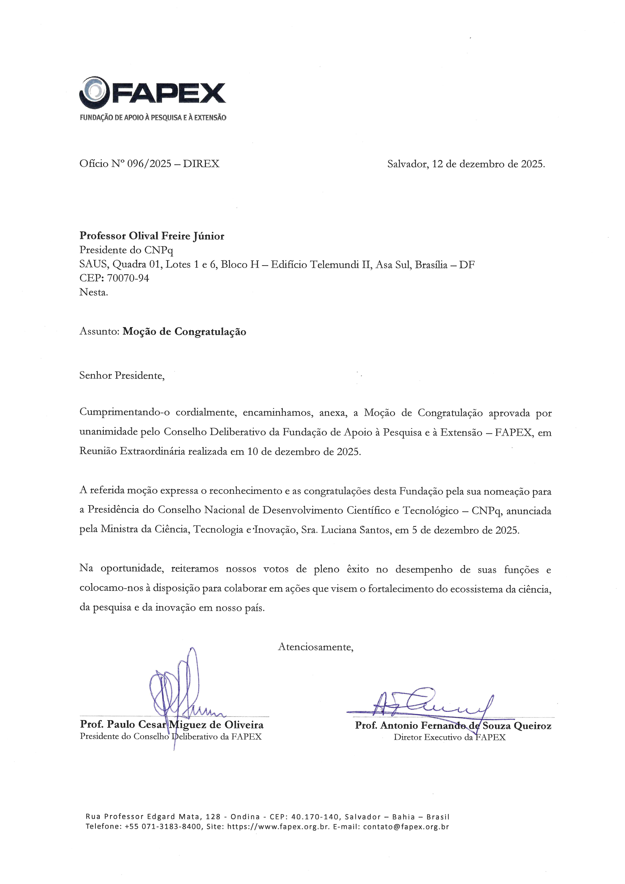 Na tarde do dia 13 de janeiro de 2026, na sede do Conselho Nacional de Desenvolvimento Científico e Tecnológico (CNPq) em Brasília - DF, foi realizada a entrega da Moção de Congratulação concedida pelo Conselho Deliberativo da Fundação de Apoio à Pesquisa e à Extensão (FAPEX), aprovada por unanimidade, ao Professor Olival Freire Júnior.